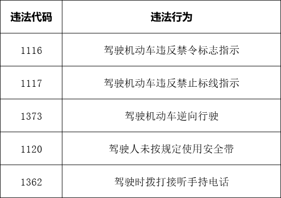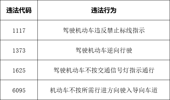 1、闯红灯抓拍设备可记录的违法行为及代码: