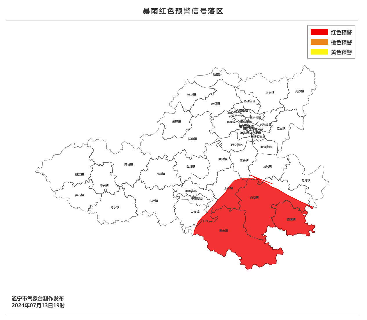 遂宁市气象台2024年07月13日19时44分更新暴雨橙色预警信号为暴雨红色预警信号:安居区三家镇、凤凰街道、磨溪镇、西眉镇、玉丰镇、安居镇等周边乡镇(街道)未来3小时降雨量将达100毫米以上。请密切关注山洪、地质灾害安全险情,做好危险区域人员撤离工作;加强道路交通安全隐患排查,做好交通设施维护;加强对建筑施工、生产经营的安全生产工作。