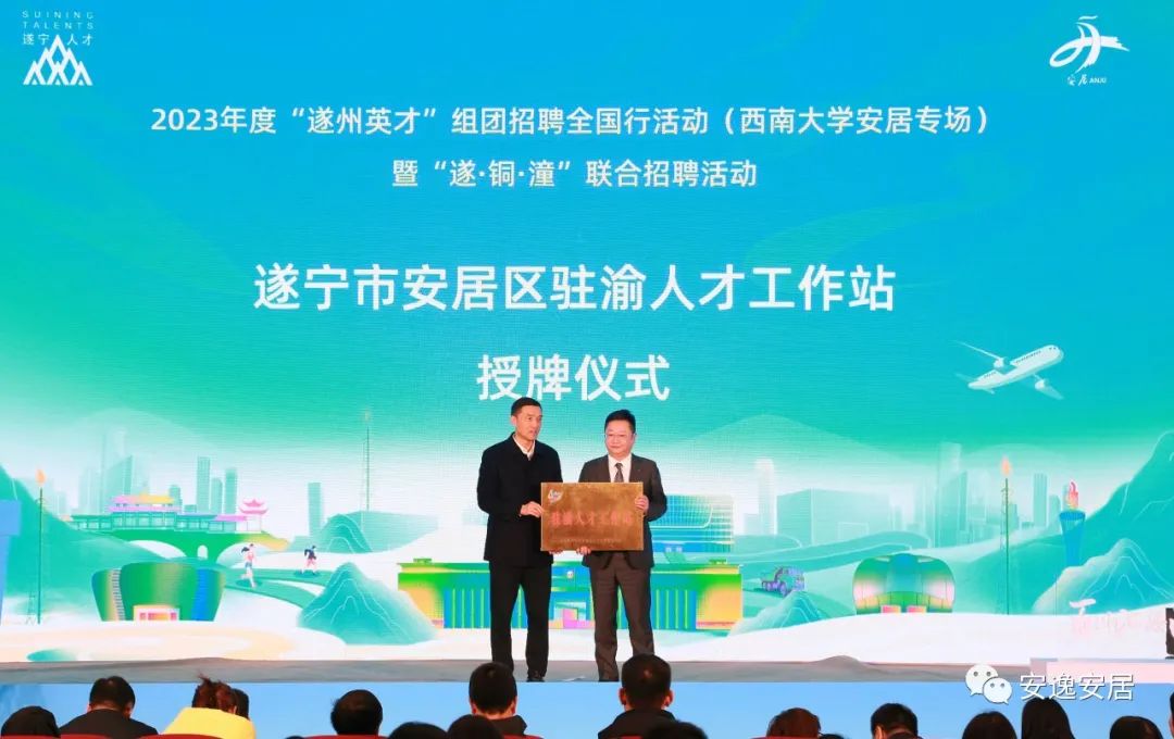 活动现场,安居区与西南大学签订了共建大学生实习实训基地合作协议。黄元章为遂宁市安居区驻渝人才工作站授牌。