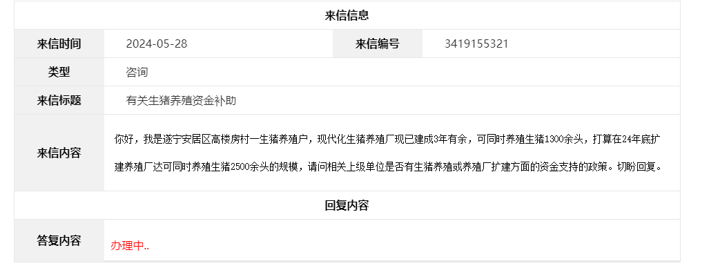 | 来信标题 | 生猪养殖和养殖厂扩建复询 |