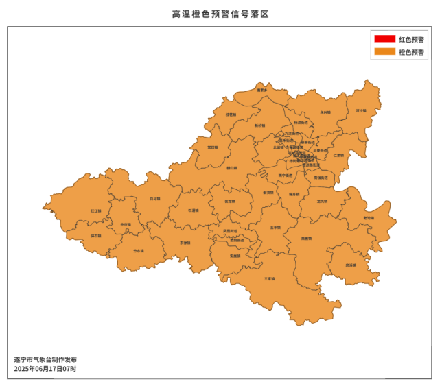 遂宁市气象台2025年6月17日7时35分发布高温橙色预警信号:预计今天白天船山区、安居区大部地方最高气温将升至38℃以上。请做好防暑降温、电力调度、水资源调配、安全生产和臭氧污染防控等工作。