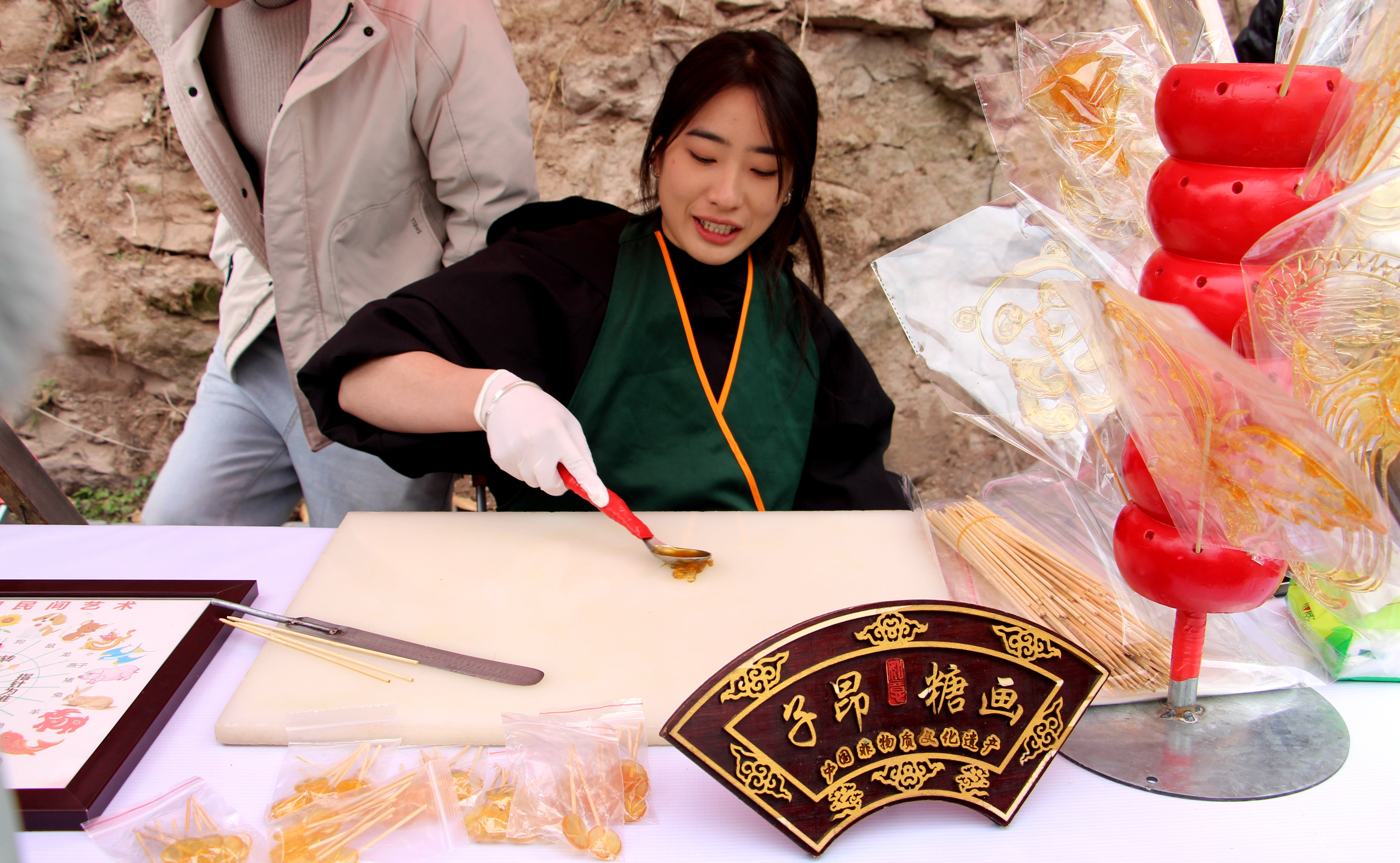 不仅如此,另一边的非遗集市内,老街麻糖、子昂糖画、太和结艺等19个非遗民俗文化通过“摆摊”的形式一字排开,在各地游客面前“争相亮相”。游客在驻足体验非遗文化的同时,还踊跃参与各种互动,“一站式”沉浸解锁非遗文化大餐。