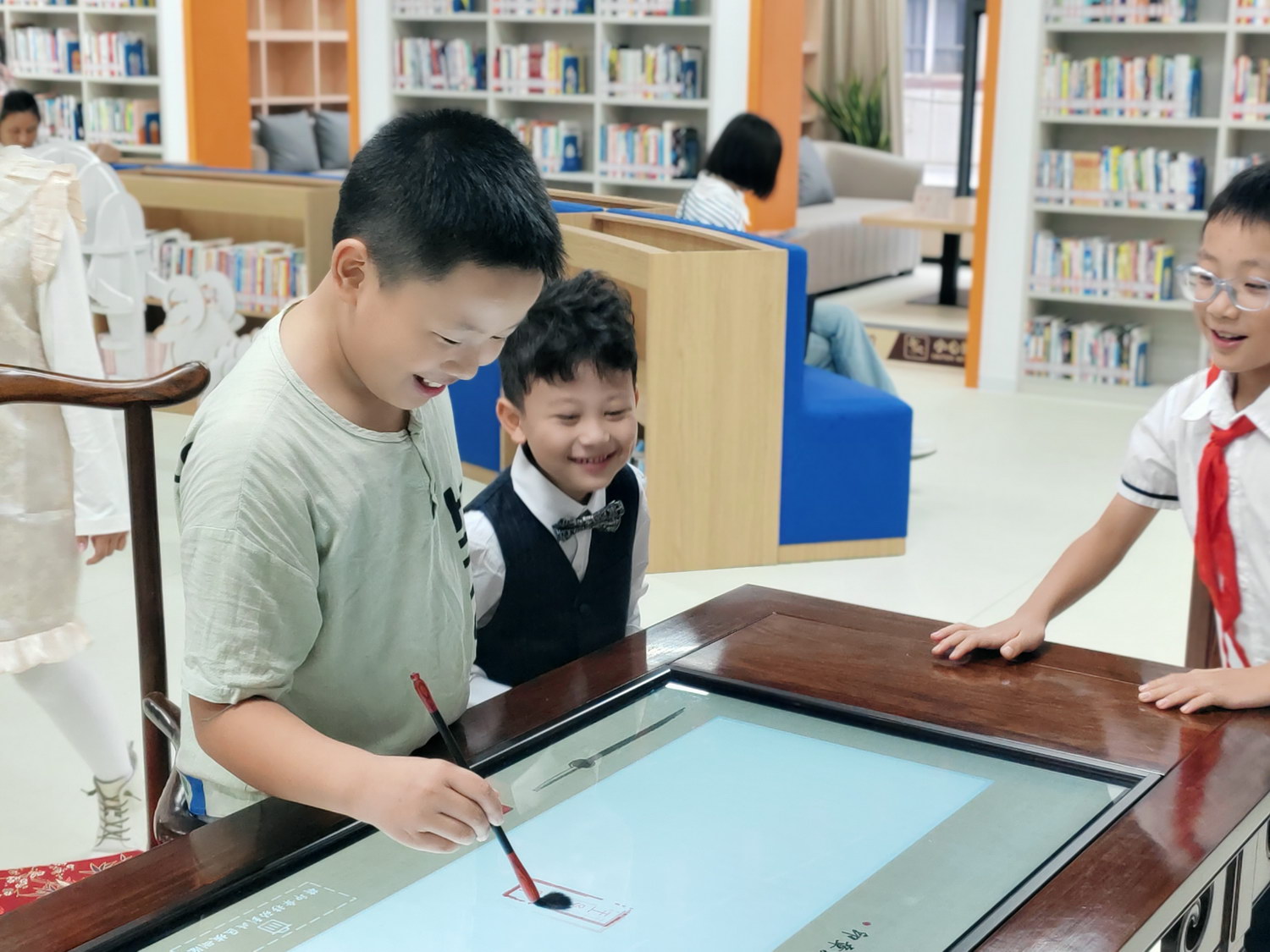 与此同时,在另一处活动空间,亲子互动区充满了欢声笑语。有家长轻声地为孩子讲述着与团圆、爱国相关的绘本故事,不时与他们互动提问。阅读启蒙在幼小的心田里,播下了热爱阅读、感知家国文化的种子。还有孩子们在屏幕上练习书法,或者两个好友来一场象棋的较量……