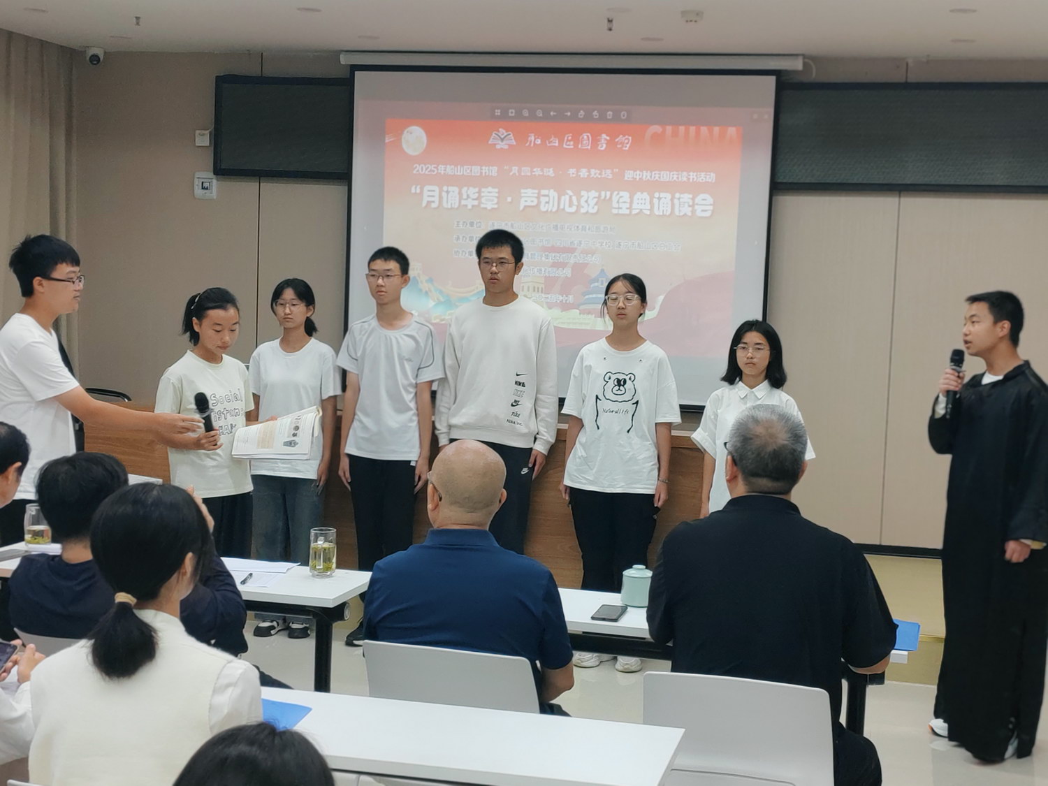 10月5日上午,图书馆多功能活动厅内座无虚席,“月诵华章·声动心弦”经典诵读会准时启幕。参与者们精选了与中秋国庆相关的美文片段,与众人分享。他们依次登台,或慷慨激昂,或深情款款。有个人朗诵者声音铿锵,展现着个体的感悟;也有家庭组合配合默契,父母与孩子的声音交织,传递着家风与传承;更有小组表演创新融入背景音乐与简单的情景演绎,让文字在声音与动作中“活”了起来。台下观众凝神静听,时而掌声雷动,时而眼含热泪,浓郁的情感在朗诵者与听众之间无声地流淌、共鸣。