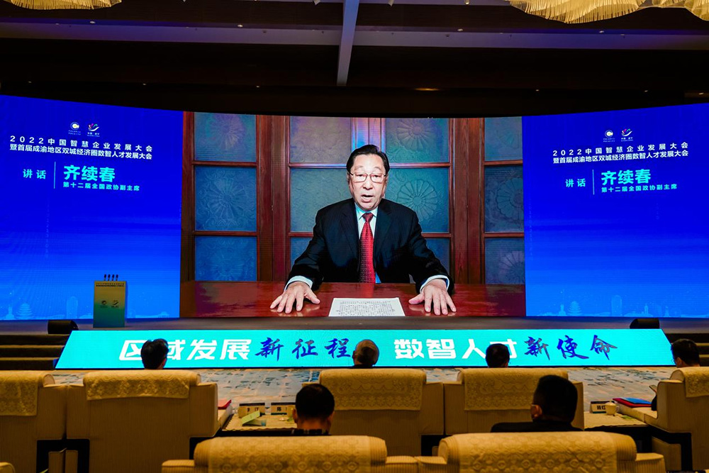 齐续春通过视频致辞,并向大会召开表示热烈祝贺。他说,习近平总书记在党的二十大报告中提出,必须坚持人才是第一资源,深入实施人才强国战略,坚持人才引领驱动。当前,全方位培养、引进、用好人才,厚植人才资源竞争优势已成为共识。成渝地区向来是群英汇聚的高地,更是新时代英雄逐鹿的赛场,智慧企业批量孵化成长、数字经济加速发展、人才活力竞相迸发、区域携手协调发展的生动图景正在加快形成。地处成渝中心节点的遂宁,在联动成渝、协同对接、聚才发展等方面具有先天区位优势,在筑“三城”兴“三都”、加速升腾“成渝之星”中更有后天持续动能。举办此次大会恰逢其势、正当其时,必将为开辟发展新领域新赛道、塑造发展新动能新优势、建设重要人才中心和创新高地注入新活力。希望成渝在全面推进中国式现代化建设的新征程中振翅翱翔,遂宁在担当推动成渝中部崛起的新使命中绽放光芒,智慧企业在重组要素资源、重塑经济结构、建设现代化产业体系中贡献智慧力量。