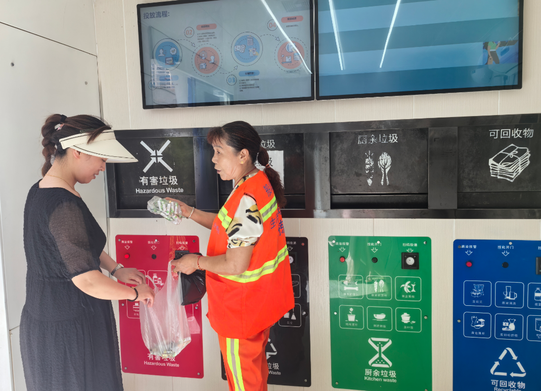 生活垃圾分拣员正耐心引导居民进行垃圾分类投放。