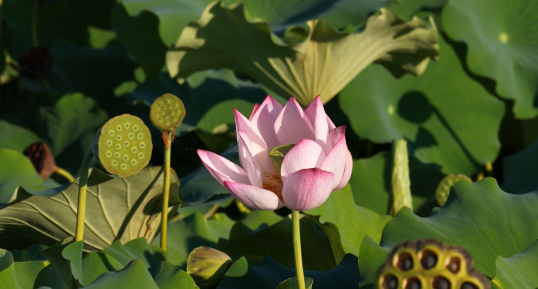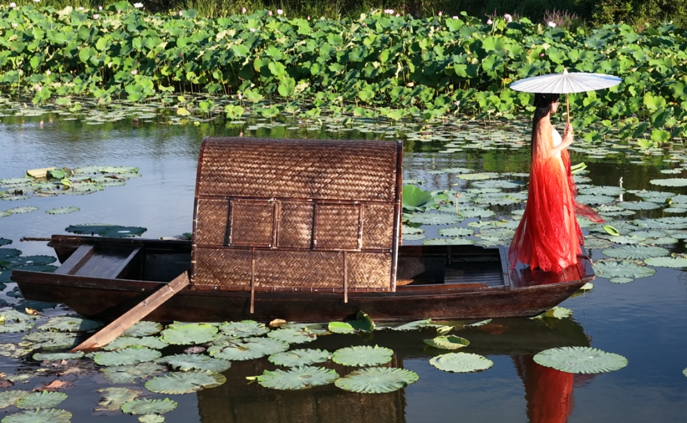 轻轻摇橹,扁舟缓缓滑入荷塘深处