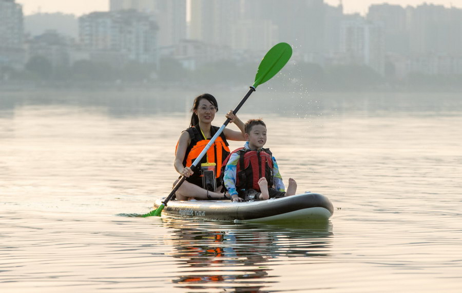 8月18日,天气晴好,一群桨板运动爱好者划行于观音湖上。8月以来,遂宁市川渝大学生(青少年)水上运动体验中心免费开放桨板及休闲皮划艇体验。每日下午4点到7点半,12岁至50岁的水上运动爱好者都可直接到场体验“中流击水,浪遏飞舟”的感觉。